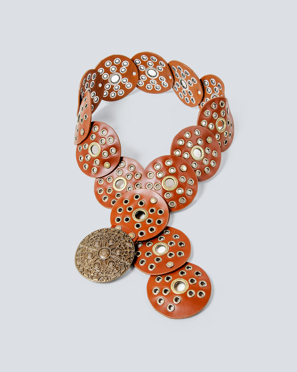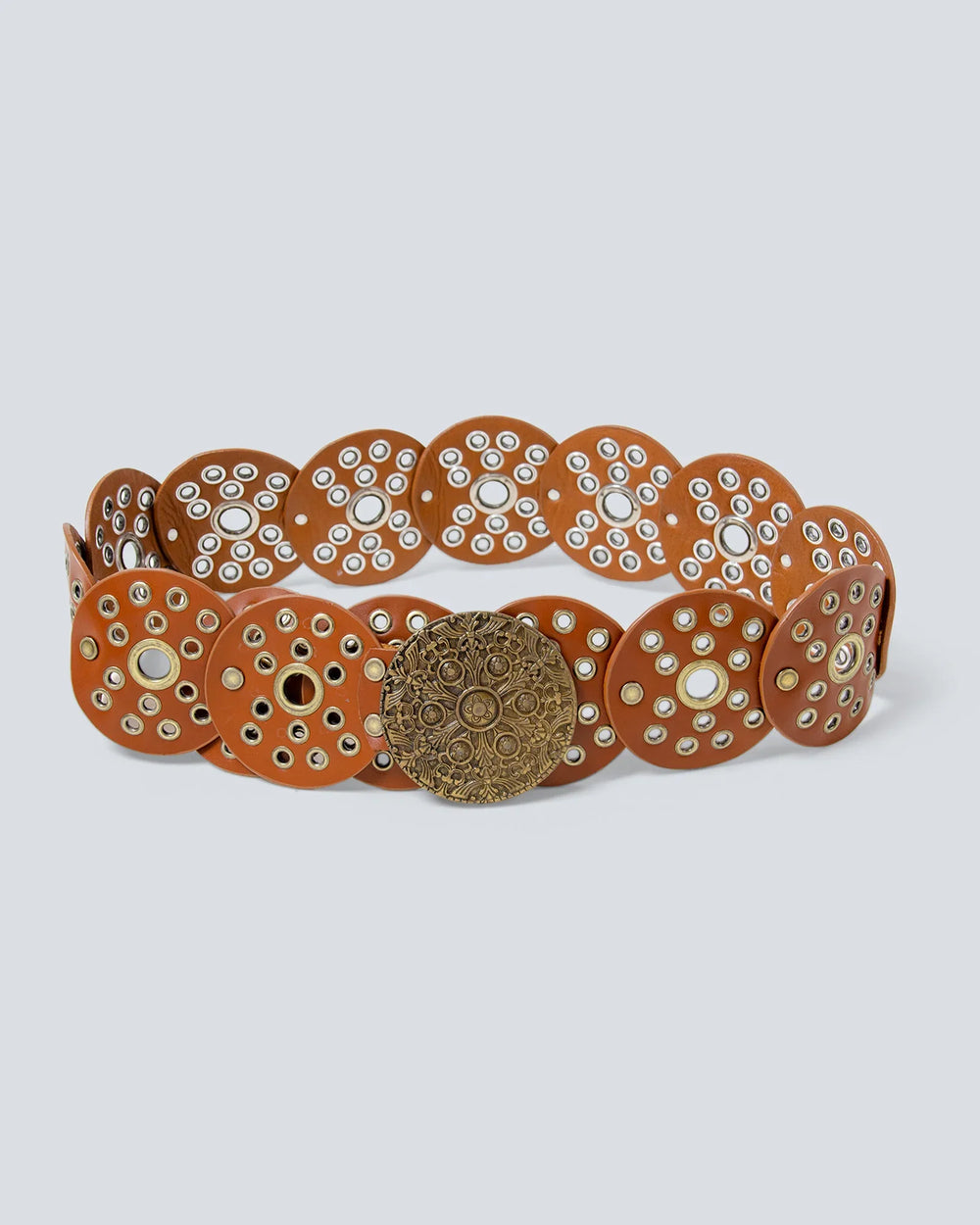 Cinturón en cuero para mujer, un diseño elaborado con 15 círculos con ojáleles decorativos. Talla única, cubre una cintura entre 60 a 80 centímetros.
